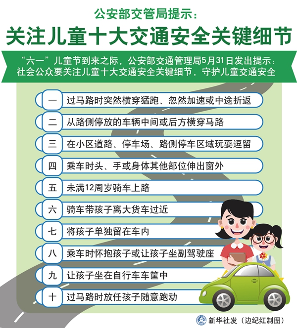 新華社北京5月31日電(記者王茜)兒童的交通危險認知、自我保護能力不強,容易受到交通意外的傷害。“六一”兒童節到來之際,公安部交通管理局31日發出提示:社會公眾要關注兒童十大交通安全關鍵細節,守護兒童交通安全。