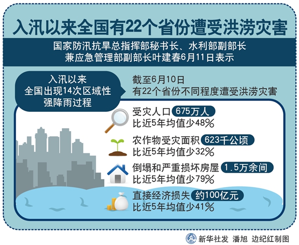 截至6月10日,農(nóng)作物受災(zāi)面積623千公頃,比近5年均值少32%;倒塌和嚴(yán)重?fù)p壞房屋1.5萬余間,比近5年均值少79%;直接經(jīng)濟損失約100億元,比近5年均值少41%。