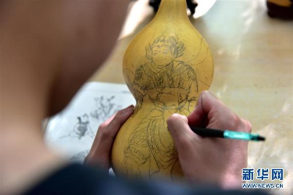 午后陽光和煦,聽障生創(chuàng)新創(chuàng)業(yè)工作室里,來自貴州的徐崇瑞手持鉛筆,在一個嶄新的葫蘆上勾勒年畫,筆法細(xì)膩,有條不紊。身后的書架上整齊擺放著他們制作的葫蘆烙畫、手工皮包、糧食鑲嵌畫等作品。