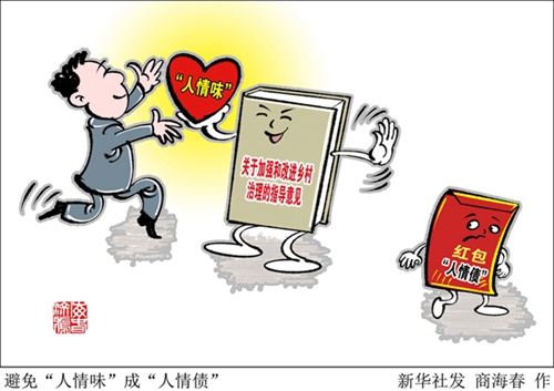 近日,中辦、國(guó)辦印發(fā)《關(guān)于加強(qiáng)和改進(jìn)鄉(xiāng)村治理的指導(dǎo)意見》。意見提出,全面推行移風(fēng)易俗,整治農(nóng)村婚喪大操大辦、高額彩禮、鋪張浪費(fèi)、厚葬薄養(yǎng)等不良習(xí)俗。依靠群眾因地制宜制定村規(guī)民約,提倡把喜事新辦、喪事簡(jiǎn)辦、弘揚(yáng)孝道、尊老愛幼、扶殘助殘、和諧敦睦等內(nèi)容納入村規(guī)民約。