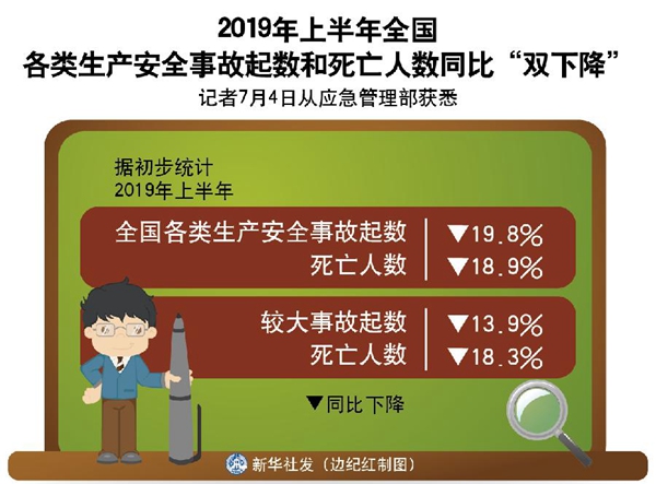 新華社北京7月4日電(記者魏玉坤、葉昊鳴)記者4日從應急管理部獲悉,據初步統(tǒng)計,今年上半年,全國各類生產安全事故起數和死亡人數同比分別下降19.8%和18.9%,較大事故起數和死亡人數同比分別下降13.9%和18.3%。