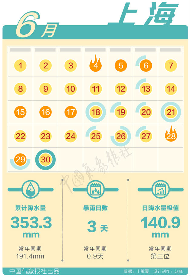 但是上海降雨可不小,累計降雨量達353.3毫米,比常年同期191.4毫米多83%。6月30日上海中心城區(qū)(徐家匯站)日降水量達140.9毫米,是1874年有記錄以來6月日最大雨量的歷史第三位,為近20年出現(xiàn)的最大暴雨。