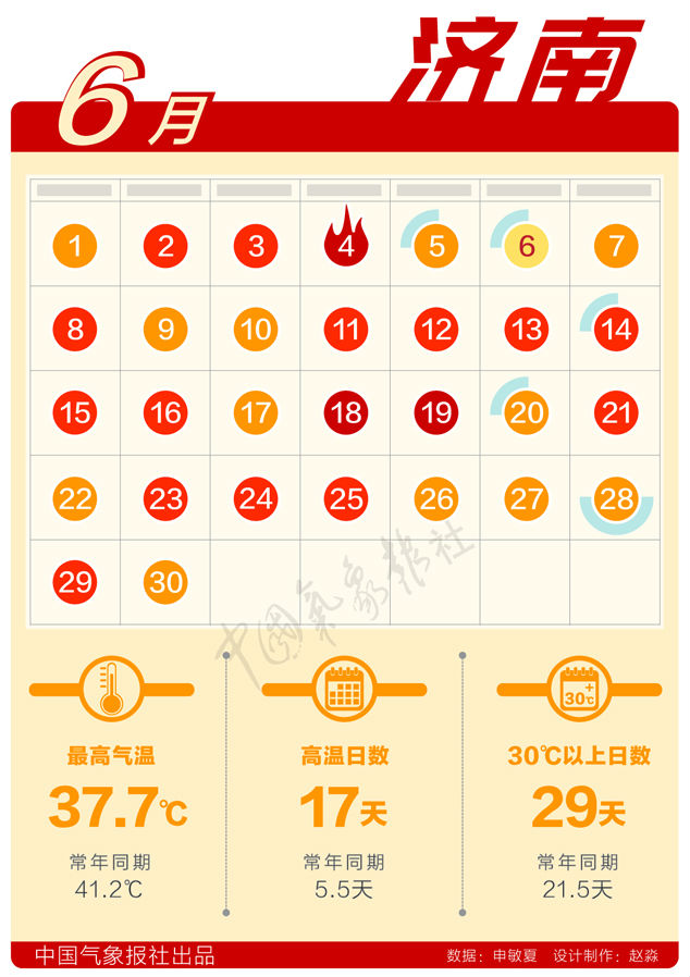 濟南:6月,濟南市區(qū)共出現(xiàn)17個高溫日,位列歷史同期第二位,第一位是1955年22個高溫日。最高氣溫37.7℃,與有記錄以來濟南市區(qū)6月最高氣溫41.2(2009年6月25日)還差一點。6月35℃以上高溫日數(shù)也未突破歷史極值,但30天中有29天都是30℃以上。