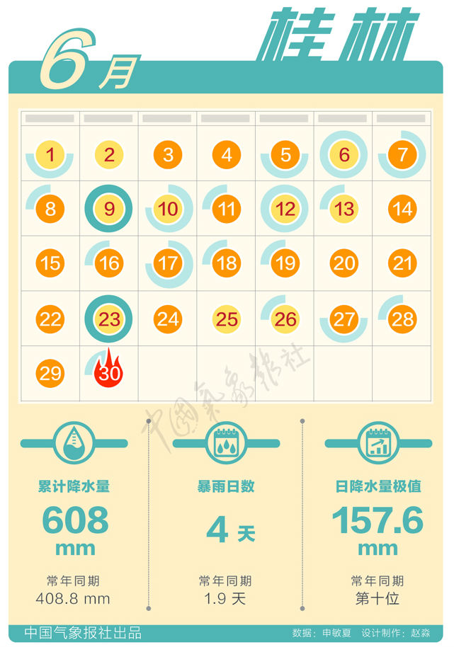 桂林:6月累計雨量大達608毫米,而且暴雨日數(shù)多,同時極端性很強。6月6日83.7毫米的日降水量、6月9日157.6毫米的日降水量、6月12日76.2毫米的日降水量,均打破同期歷史記錄極值。6月23日101.5毫米日降水量位居歷史第二。