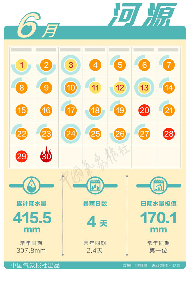 河源:廣東河源6月累計降水量達415.5毫米,比常年同期307.8毫米偏多近35%,30天中有23天在下雨,其中暴雨日數(shù)為4天,比常年同期2.4天偏多。日降水極值170.1毫米打破歷史記錄極值。(專家顧問:舒文軍 馬悅 蘇軼 高帆 蔣運志 李蒙 單雪珂 記者 申敏夏)