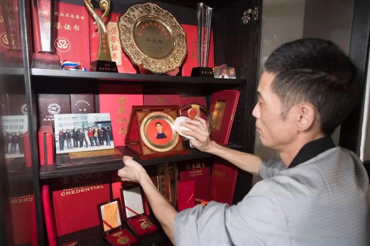 吳元渺在擦拭自己的全國(guó)五一勞動(dòng)獎(jiǎng)?wù)隆9褡永飻[放的都是他獲得的各種榮譽(yù)證書和獎(jiǎng)?wù)隆?/font>