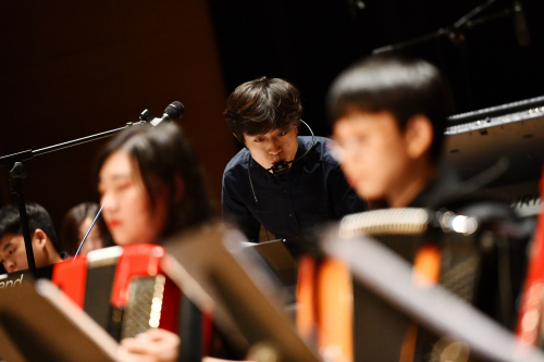 6月16日,在天津大劇院,樂(lè)團(tuán)成員李宏基(中)用電子呼吸控制器演奏曲目。 李然 攝
