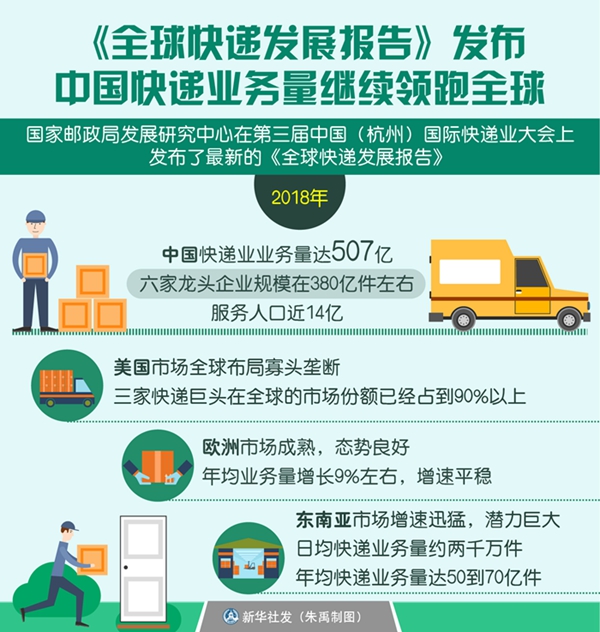 報告分析稱,中國快遞業業務量領先,市場活躍,2018年業務量達507億,六家龍頭企業規模在380億件左右,服務人口近14億;美國市場全球布局寡頭壟斷,三家快遞巨頭在全球的市場份額已經占到90%以上;歐洲市場成熟,態勢良好,年均業務量增長9%左右,增速平穩;東南亞市場增速迅猛,潛力巨大,日均快遞業務量約兩千萬件,年均快遞業務量達50到70億件。