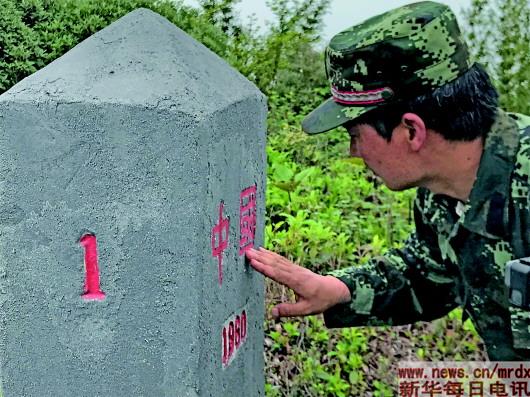 “第一次見到界碑時,特別激動,看到‘中國’二字,特別自豪!”在同伴的帶領下,蔡新裝用了半天時間爬到山頂,他快步上前,撫摸著碑身,擦拭著界碑上的字符,在擦拭“中國”二字時特別用心。然后仔細查看界碑周圍的情況,用砍刀修剪草叢,還用手機拍下一張界碑的照片。