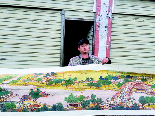 2018年4月,我陪同縣委書記皮貴懷到五德鎮(zhèn)調研,每到一個村都選擇走訪幾戶貧困戶。當來到團結村時,鎮(zhèn)黨委書記周勝帶領我們走進了吳琰的家??h委書記來到吳琰家時,他不僅沒有像一些貧困戶那樣訴苦,還立即拿出自己刺繡的得意之作——七米長的“清明上河圖”,展示在書記面前。