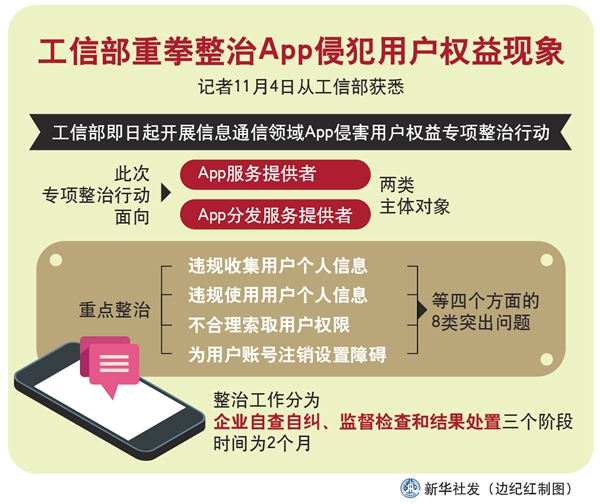 新華社北京11月4日電(記者張辛欣)記者4日從工信部獲悉,工信部即日起開(kāi)展信息通信領(lǐng)域App侵害用戶權(quán)益專項(xiàng)整治行動(dòng)。對(duì)違規(guī)收集用戶個(gè)人信息、違規(guī)使用用戶個(gè)人信息等8類突出問(wèn)題重拳整治。