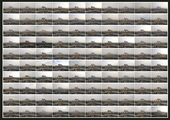 拍攝進行到3個月多后,周健仕把照片整理成專題,命名為《杭州空氣百日祭》。在那幅作品當中,參照物和背景基本相同,唯一變化的是清晰度:除了少數幾張有藍天白云,幾乎所有的照片都是灰色的。