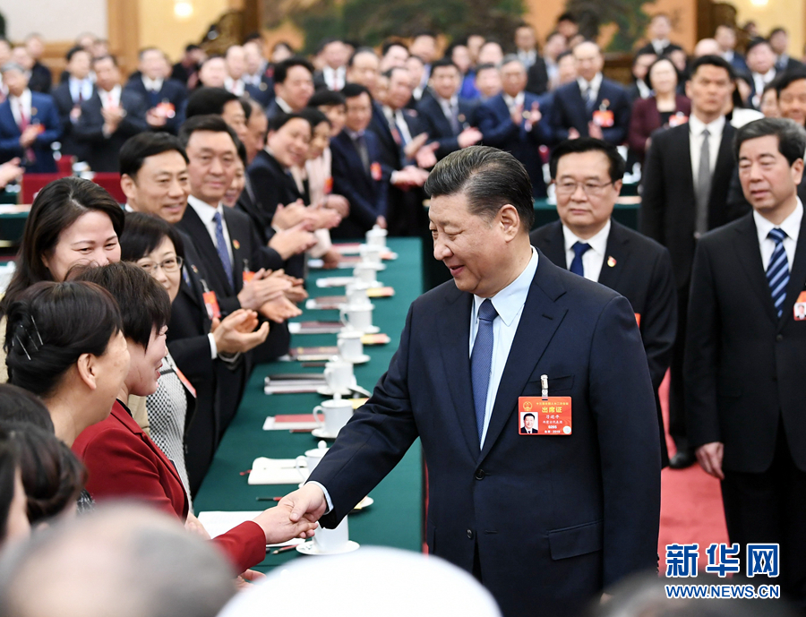 3月8日,中共中央總書記、國家主席、中央軍委主席習近平參加十三屆全國人大二次會議河南代表團的審議。在“三八”國際勞動婦女節到來之際,習近平代表黨中央,向參加全國兩會的女代表、女委員、女工作人員,向全國各族各界婦女,致以節日的祝賀和美好的祝福。這是習近平同女代表親切握手。新華社記者 謝環馳 攝