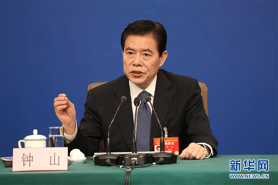 十三屆全國人大二次會議新聞中心3月9日(星期六)10時30分在梅地亞中心新聞發布廳舉行記者會,邀請商務部部長鐘山、副部長兼國際貿易談判副代表王受文、副部長錢克明就“促進形成強大國內市場 推動全方位對外開放”相關問題回答中外記者提問。圖為商務部部長鐘山。新華網/中國政府網 陳杰 攝