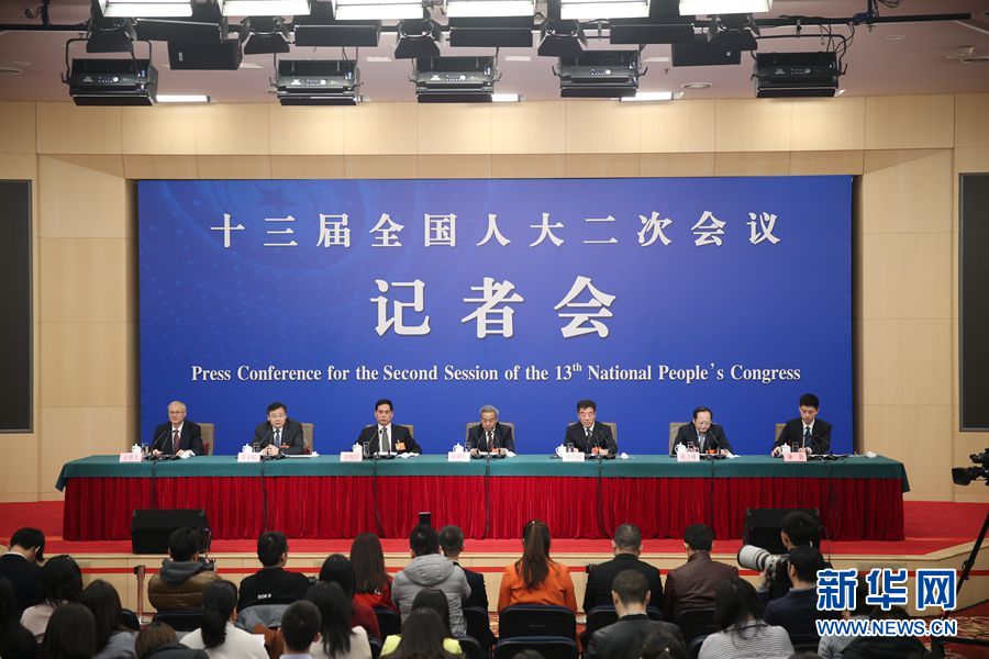 十三屆全國人大二次會議新聞中心3月9日在梅地亞中心新聞發布廳舉行記者會,邀請全國人大農業與農村委員會主任委員陳錫文、全國人大財政經濟委員會副主任委員烏日圖、全國人大常委會法制工作委員會副主任劉俊臣、全國人大常委會法制工作委員會副主任許安標、全國人大環境與資源保護委員會委員程立峰就“人大立法工作”相關問題回答記者提問。圖為記者會現場。新華網/中國政府網 劉廈 攝