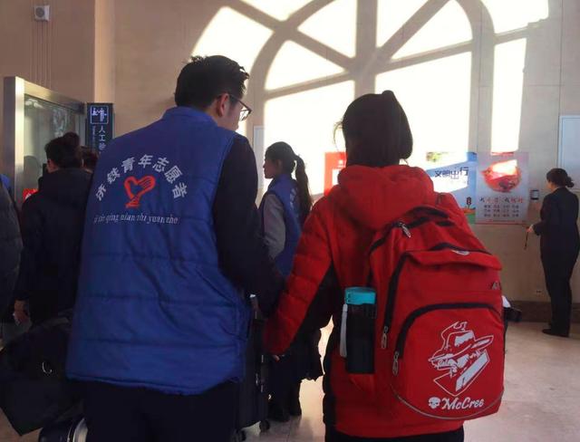 春運首日,青島職業技術學院在青島站協助青島盲校的盲童們踏上回家路。