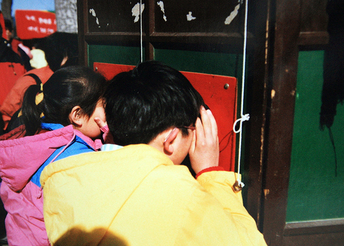 2014年2月4日,國際象棋世界冠軍謝軍(左)在龍潭廟會活動現場與一位小朋友交流。(圖片來源:新華社 記者 公磊攝)