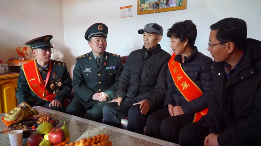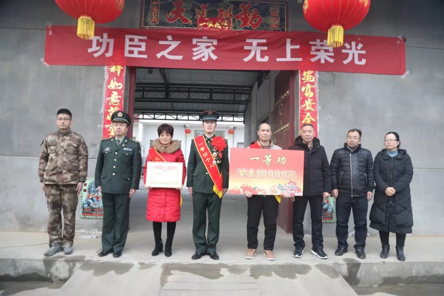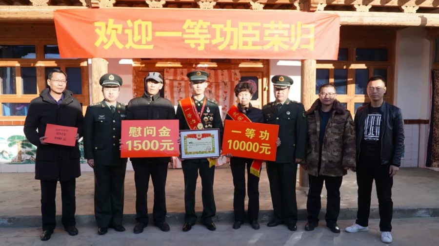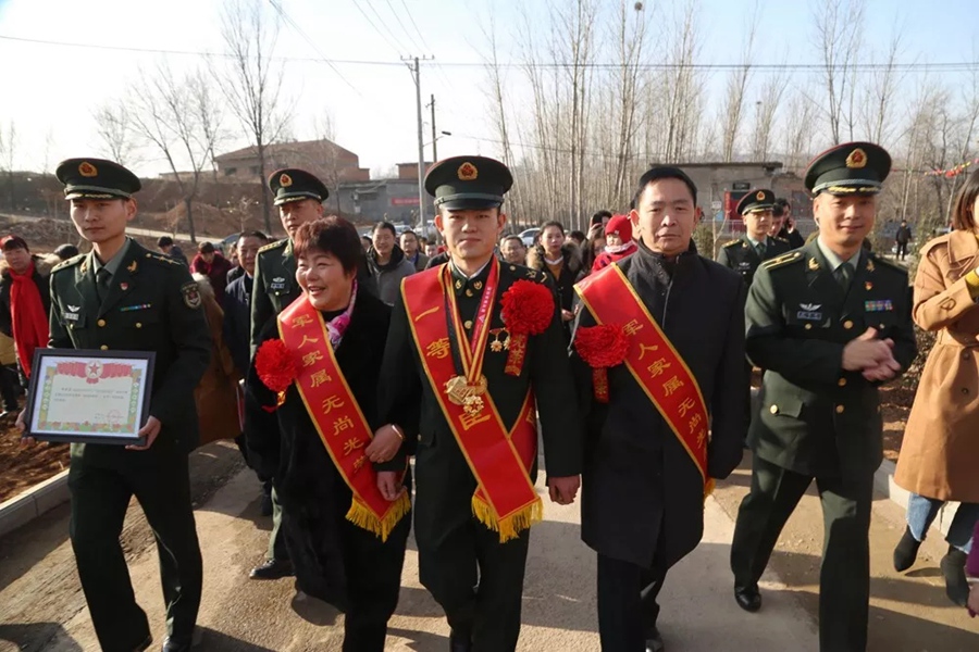 功臣黃曉龍和父母在各級領導和村民的簇擁下回到家中