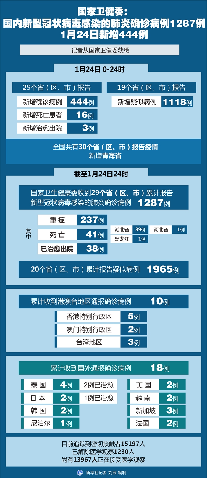 截至1月24日24時(shí),國(guó)家衛(wèi)健委收到29個(gè)省(區(qū)、市)累計(jì)報(bào)告新型冠狀病毒感染的肺炎確診病例1287例,其中重癥237例,死亡41例(湖北省39例、河北省1例、黑龍江1例)。已治愈出院38例。20個(gè)省(區(qū)、市)累計(jì)報(bào)告疑似病例1965例。