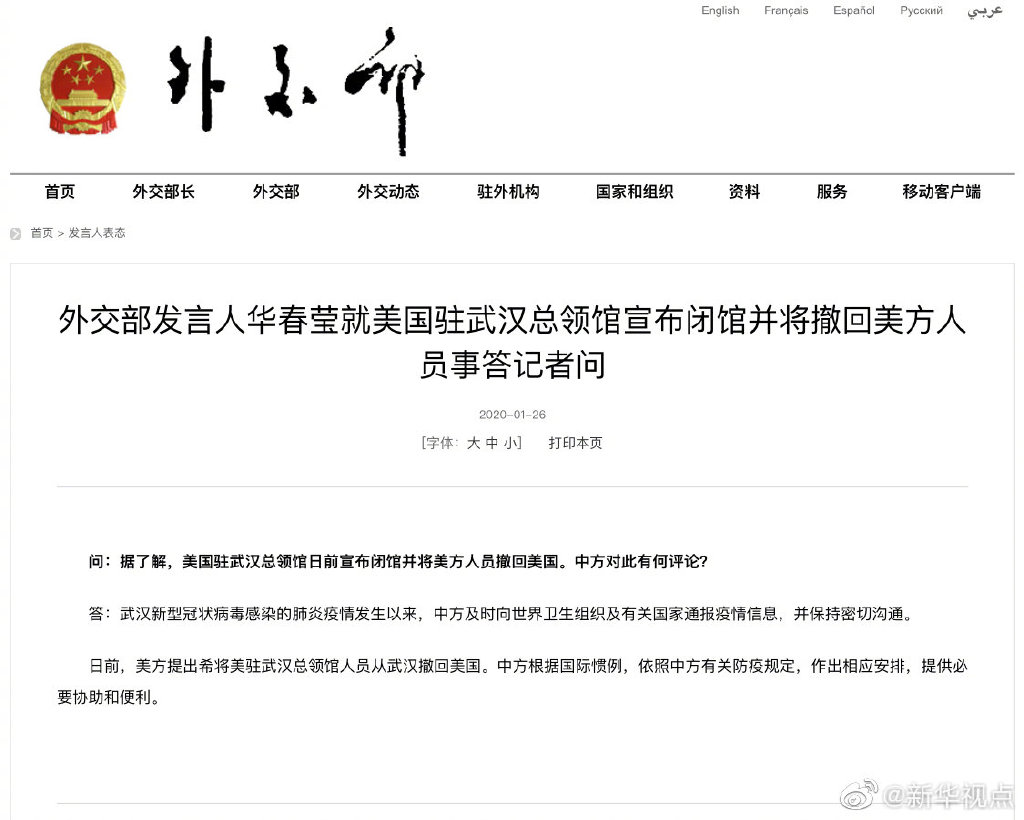 針對(duì)有報(bào)道說美國(guó)駐武漢總領(lǐng)館日前宣布閉館并將美方人員撤回美國(guó),外交部發(fā)言人華春瑩26日回答記者提問時(shí)表示,武漢新型冠狀病毒感染的肺炎疫情發(fā)生以來,中方及時(shí)向世界衛(wèi)生組織及有關(guān)國(guó)家通報(bào)疫情信息,并保持密切溝通。日前,美方提出希將美駐武漢總領(lǐng)館人員從武漢撤回美國(guó)。中方根據(jù)國(guó)際慣例,依照中方有關(guān)防疫規(guī)定,作出相應(yīng)安排,提供必要協(xié)助和便利。