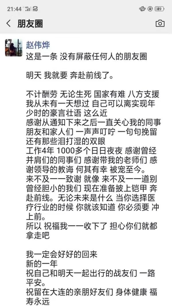 通知下發后,大連各大醫院醫護人員紛紛主動請纓:“只要被需要,義無反顧,放心吧主任,我強壯”“主任,我也可以去武漢,等待您的派遣”“一切聽從組織安排”“需要我們的時候到了,沒有硝煙的戰場需要我們,我自愿加入抗擊疫情的隊伍”……醫院微信群里被自愿報名聲刷屏。