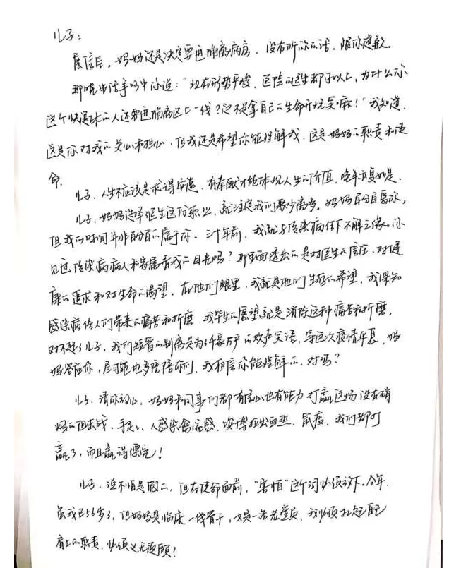在較早收治確診病例的湖南省郴州市第二人民醫院,一封抗疫醫生的家書引人注目。家書是作為醫生的媽媽,在即將進入隔離病房前,寫給帶女朋友回家過年的兒子的。
