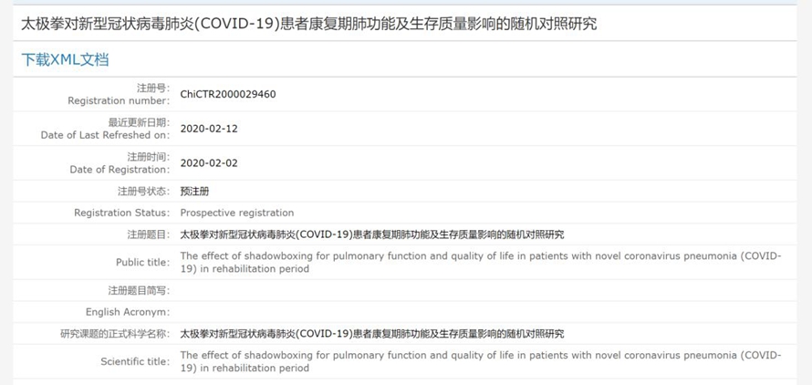 近日,記者用“新型冠狀病毒肺炎”等關(guān)鍵詞,在中國(guó)臨床試驗(yàn)注冊(cè)中心查詢發(fā)現(xiàn),截至2月12日已有60項(xiàng)符合檢索條件的試驗(yàn)。這些臨床試驗(yàn)內(nèi)容非常廣泛,既包括多種西藥、干細(xì)胞、中藥、重要注射劑,還包括社區(qū)干預(yù)療法等。令記者沒(méi)想到的是,其中竟然還有一項(xiàng)預(yù)注冊(cè)方案,準(zhǔn)備研究太極拳對(duì)患者康復(fù)期肺功能及生存質(zhì)量的影響。