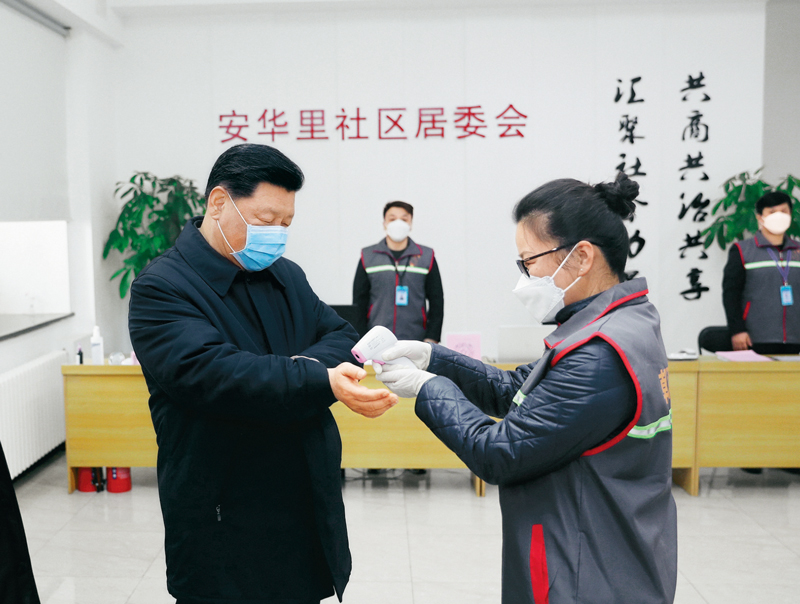 2020年2月10日,中共中央總書記、國(guó)家主席、中央軍委主席習(xí)近平在北京調(diào)研指導(dǎo)新冠肺炎疫情防控工作。這是習(xí)近平來到朝陽區(qū)安貞街道安華里社區(qū),了解基層一線疫情聯(lián)防聯(lián)控情況。 新華社記者 鞠鵬/攝
