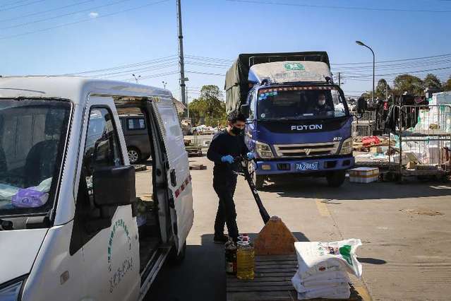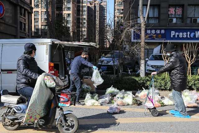 2月16日,湖北省武漢市,送菜小哥許可(中)在卸貨。中青報·中青網(wǎng)記者 趙迪攝