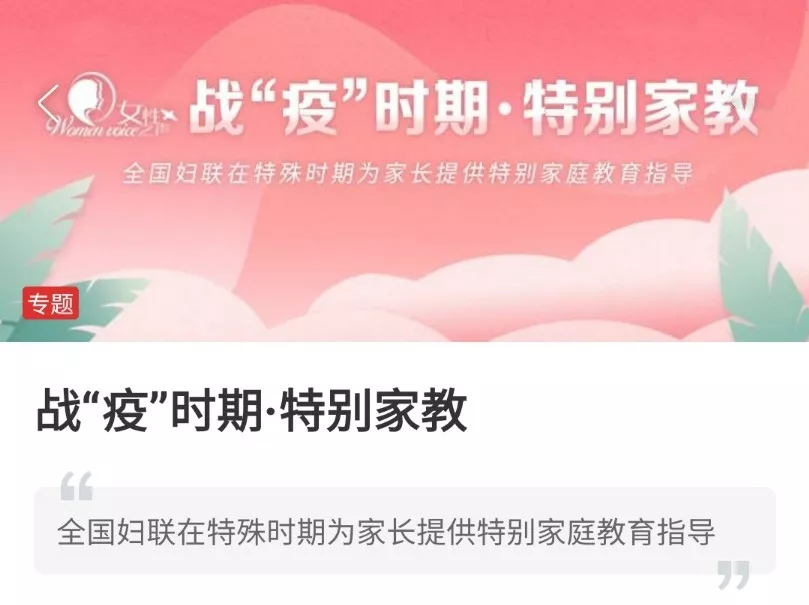 為在特殊時期守護孩子們的成長,全國婦聯聯合人民網、人民日報客戶端推出“特殊時期 特別家教”專題,用深受孩子們歡迎的繪本有聲讀物,包含防疫知識等內容的親子學習和游戲互動,讓廣大家庭“宅在家,學在家”。