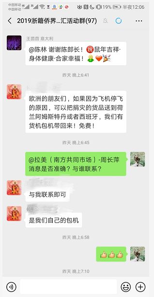 2月1日晚,浙江省僑界名媛匯微信群里的一則信息引起了大家的注意。“歐洲的朋友們,如果因?yàn)轱w機(jī)停飛的原因,可以把捐災(zāi)的貨品送到荷蘭阿姆斯特丹或者西班牙,我們有貨機(jī)包機(jī)帶回來(lái)!免費(fèi)!”群里瞬間沸騰,求助信息紛至沓來(lái)。省僑聯(lián)黨組書(shū)記、主席連小敏捕捉到這一信息,隨即高度重視,求證確認(rèn)后,第一時(shí)間研究討論,展開(kāi)部署。