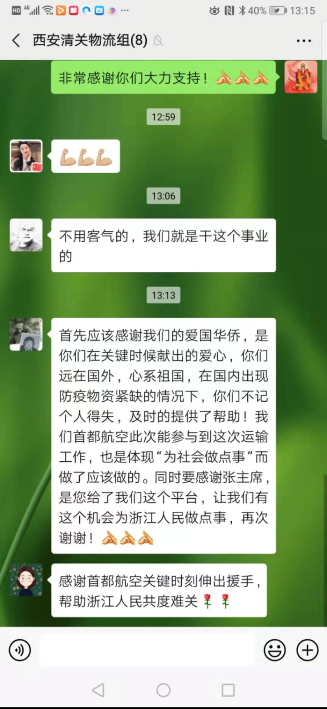特別值得一提的是海航集團(tuán)的譚向東副董事長(zhǎng)、高建副總裁,為了協(xié)助我們把捐贈(zèng)物資盡快運(yùn)回國(guó)內(nèi),高度重視,靠前指揮,第一時(shí)間給予全面而具體的支持。旗下的首都航空公司市場(chǎng)部副總顧凌毅、貨運(yùn)中心高級(jí)經(jīng)理田國(guó)偉協(xié)調(diào)陳肖藝、倪福元、李小戈、首航西安基地總監(jiān)周瑞喜、海航速運(yùn)境外管理部副總經(jīng)理池夢(mèng)瑩以及郭宇萍等一批業(yè)務(wù)骨干加班加點(diǎn),克服了時(shí)間緊張,物資量大,境外時(shí)差等諸多困難,創(chuàng)造了許多個(gè)“首航第一次”。蟠龍國(guó)際集團(tuán)、中遠(yuǎn)海運(yùn)航空公司則為這場(chǎng)“空中接力”提供了高端快捷的航空物流平臺(tái)。而在第四批物資回運(yùn)過(guò)程中,更是得到了溫州市防疫指揮部的鼎力相助,幫助我們把西班牙巴塞羅那收集點(diǎn)上的捐贈(zèng)物資,從布魯塞爾轉(zhuǎn)道回國(guó)。