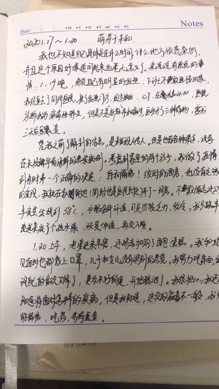 “1月20日—22日,第一次復(fù)查。食欲不振,發(fā)熱一陣一陣的,身體發(fā)虛,四肢無力,檢測結(jié)果為疑似病例,心中仍然忐忑,不知道自己的病情將走向何方。”