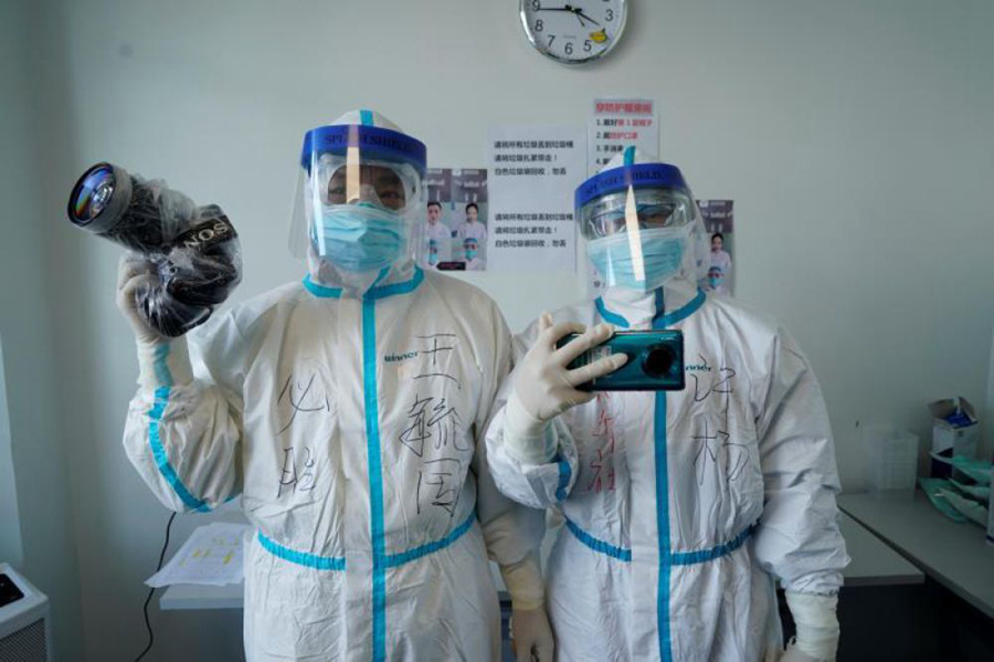 2月18日,新華社記者王毓國(左)、許楊在華中科技大學同濟醫院中法新城院區準備進入隔離病房內采訪。新華社記者 余國慶 攝