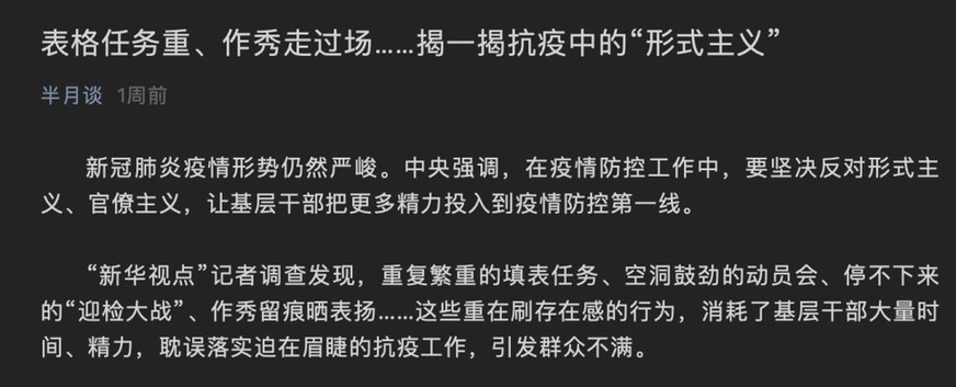 受訪基層干部表示,在基層抗疫中,鄉(xiāng)鎮(zhèn)和部門黨政一把手是“前線指揮”,應該時刻在前線進行調(diào)度和決斷,而不是在會場。中部某市衛(wèi)健委一位負責人反映,最近日夜奮戰(zhàn),有時要忙到夜里兩三點鐘,工作內(nèi)容包括長時間開會、寫材料、組織業(yè)務調(diào)度等。“自己就要倒掉了,希望能在會議上減減負。”