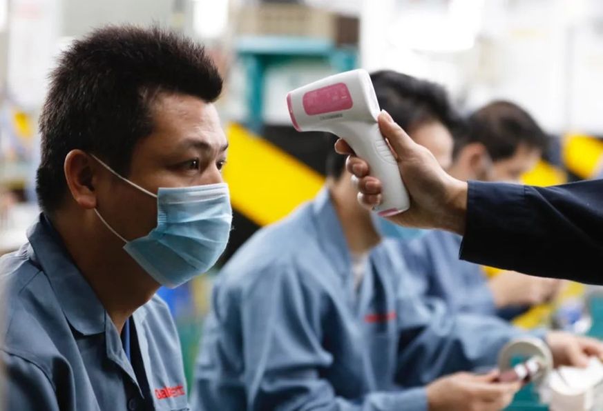 2月10日,廣東格蘭仕集團有限公司順德總部車間生產(chǎn)線上的員工測體溫。新華社記者 黃國保 攝