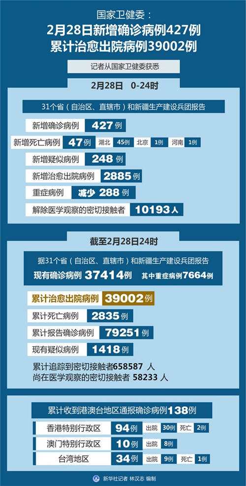 截至2月28日24時,據31個省(自治區、直轄市)和新疆生產建設兵團報告,現有確診病例37414例(其中重癥病例7664例),累計治愈出院病例39002例,累計死亡病例2835例,累計報告確診病例79251例,現有疑似病例1418例。累計追蹤到密切接觸者658587人,尚在醫學觀察的密切接觸者58233人。