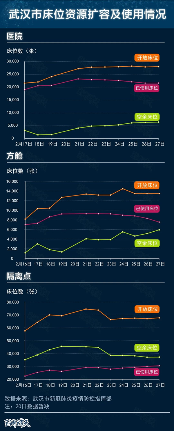 截止到27日,武漢醫院中的空余床位數達到了6409張。