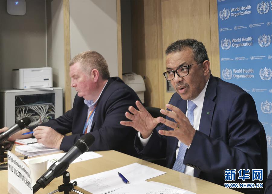 3月2日,在瑞士日內瓦,世界衛生組織總干事譚德塞(右)出席當天的世衛組織例行記者會。新華社記者 陳俊俠 攝