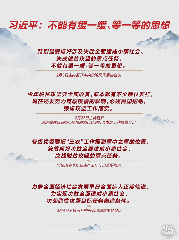 去年3月7日,習(xí)近平在甘肅代表團(tuán)專門談脫貧攻堅(jiān),“不獲全勝、決不收兵!”今年3月6日,距離收官已不足10個(gè)月,決戰(zhàn)決勝脫貧攻堅(jiān)座談會(huì)在北京召開。習(xí)近平在會(huì)上說,“到2020年現(xiàn)行標(biāo)準(zhǔn)下的農(nóng)村貧困人口全部脫貧,是黨中央向全國(guó)人民作出的鄭重承諾,必須如期實(shí)現(xiàn),沒有任何退路和彈性”。