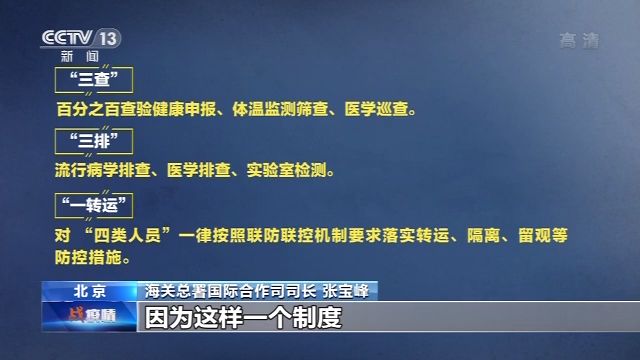 海關總署國際合作司司長 張寶峰:“三查”“三排”“一轉運”是我們海關多年來摸索探索形成的一個比較成熟的、規范的應對重大國外疫情傳入的制度模式。運行這個模式,主要有三個方面,第一就是海關的執行,海關在執行方面我們是非常有信心的。