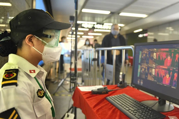 3月9日,在廣州地鐵海珠廣場站,工作人員通過紅外線體溫儀對進站乘客體溫進行監測。新華社記者 盧漢欣 攝