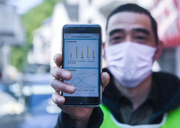 2月20日,在浙江省杭州市富陽區上官鄉芳村檢查點,工作人員展示手機上的“疫情防控云圖”的實時數據。新華社記者 徐昱 攝