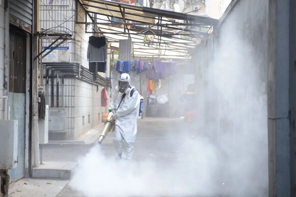 2月5日,長沙藍天救援隊隊員在長沙市馬王街社區內消毒殺菌。新華社發(陳振海攝)