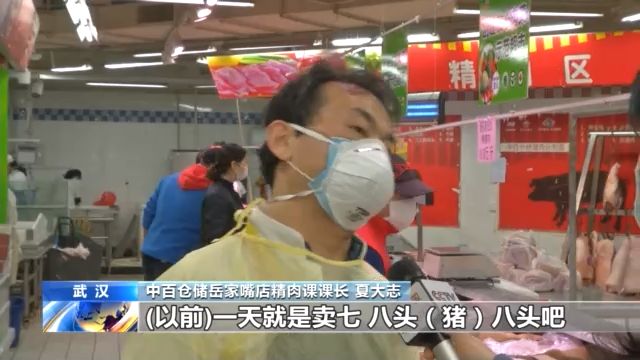中百倉儲(chǔ)岳家嘴店精肉課課長 夏大志:以前賣8頭豬16片,現(xiàn)在賣15頭 30片,冷凍肉一天要賣一兩噸,箱子裝的100多箱。