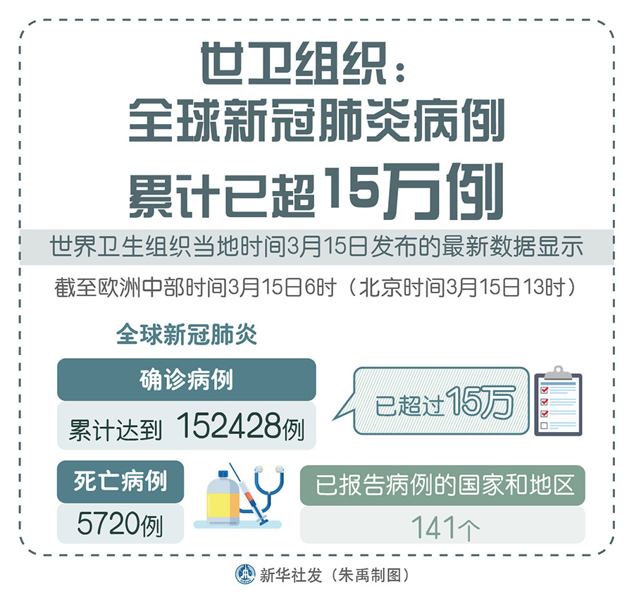 新華社日內瓦3月15日電(記者劉曲)世界衛生組織15日發布的最新數據顯示,全球新冠肺炎病例累計已超過15萬,達到152428例。