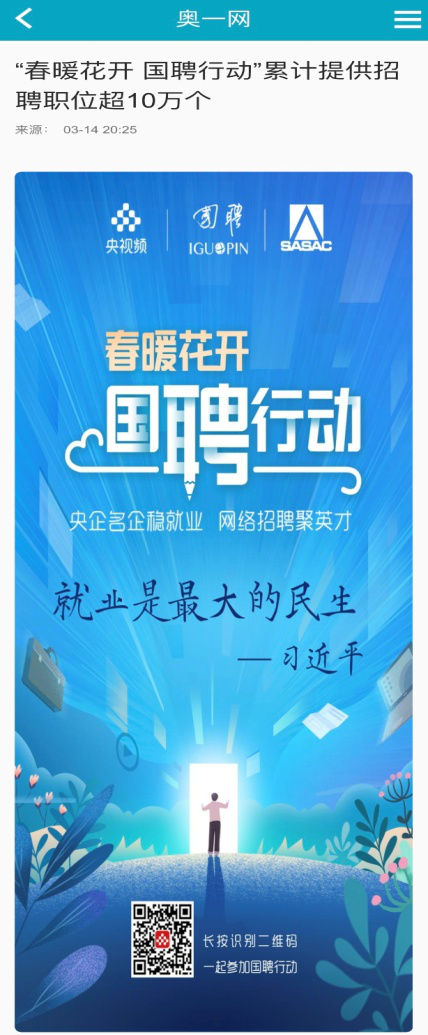 由中央廣播電視總臺“央視頻”攜手國投集團,與國務院國資委共同推出的大型線上招聘活動——“春暖花開 國聘行動”,自3月2日啟動以來,企業踴躍參與,求職者紛紛投遞簡歷。截至3月14日已面向社會提供了超10萬個招聘職位,累計入駐企業近2500家,引發眾多媒體和網站轉載報道。