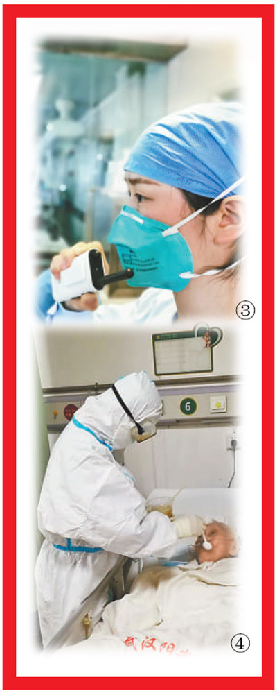 從1月3日至今,今年26歲的武漢市肺科醫(yī)院護(hù)士朱靜(圖③)已經(jīng)在ICU病房連續(xù)工作了兩個多月。
