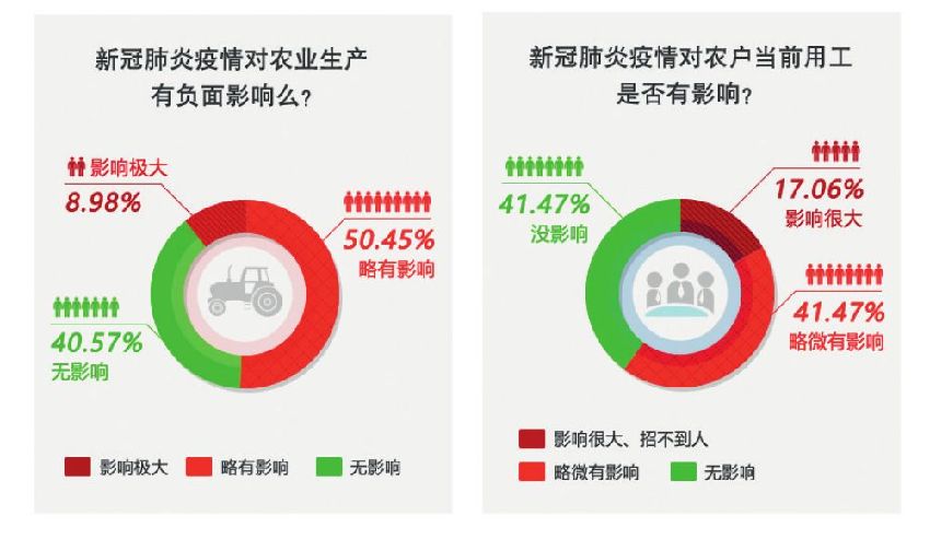 557份有效問(wèn)卷數(shù)據(jù)顯示,8.98%的農(nóng)戶(hù)認(rèn)為疫情對(duì)農(nóng)業(yè)生產(chǎn)負(fù)面影響極大,50.45%的農(nóng)戶(hù)認(rèn)為略有影響。在疫情對(duì)用工影響上,17.06%的農(nóng)戶(hù)反映影響大、招不到人,41.47%的農(nóng)戶(hù)認(rèn)為略微有影響。(見(jiàn)圖1)