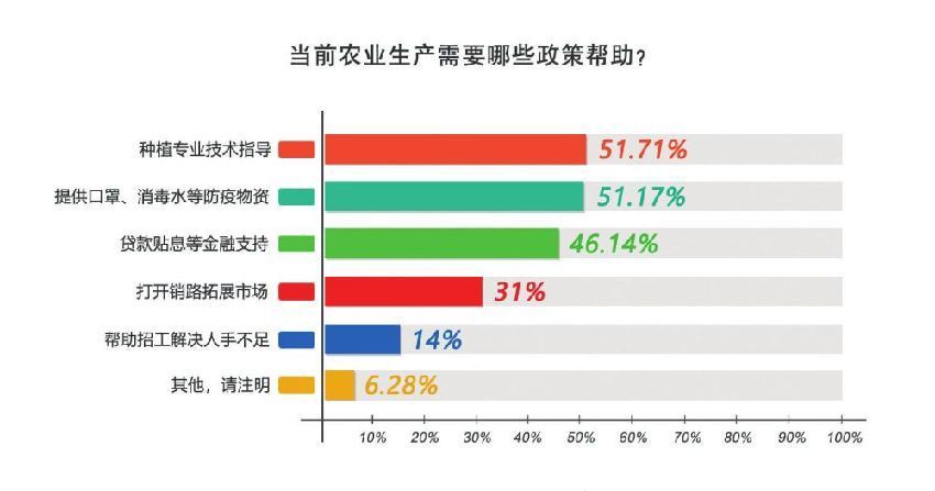 加強(qiáng)農(nóng)技指導(dǎo),給予金融支持。問(wèn)卷調(diào)查中農(nóng)戶(hù)提出多項(xiàng)政策需求,51.71%的農(nóng)戶(hù)希望得到種植專(zhuān)業(yè)技術(shù)指導(dǎo),51.17%的農(nóng)戶(hù)呼吁提供口罩、消毒液等防疫物資,46.14%的農(nóng)戶(hù)則希望得到貸款貼息等金融扶持。(見(jiàn)圖4)